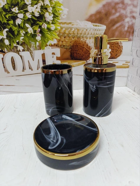 Набір керамічний для ванної кімнати 3 предмети чорний із золотом 3098