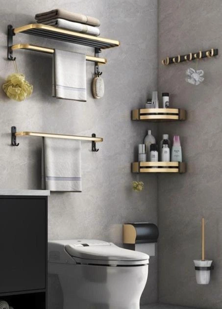 Набір аксесуарів для ванної 6 в 1 чорний (кутова полиця, вішалка, тримач рушників, йоржик, гачки, тримач паперу)
