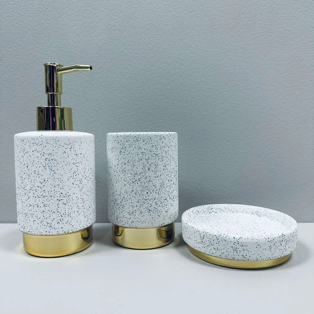 Набір для ванної кімнати (3 предмети) дозатор для мила, склянка для зубних щіток та мильниця Білий граніт із золотом Bona Di
