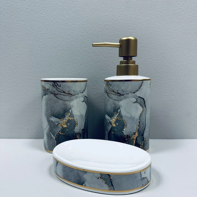 Набір для ванної кімнати (3 предмети) дозатор для мила, склянка для зубних щіток та мильниця Сірий мармур із золотом Bona Di