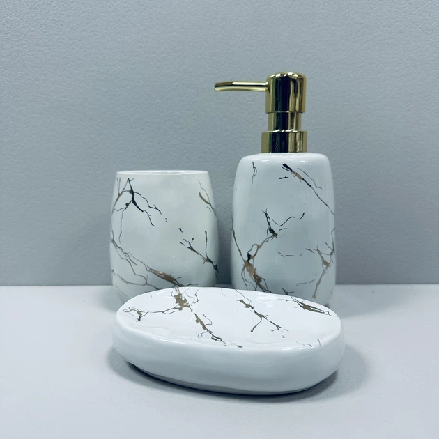 Набір для ванної кімнати (3 предмети) дозатор для мила, склянка для зубних щіток та мильниця Bona Di 853-171 білий мармур із