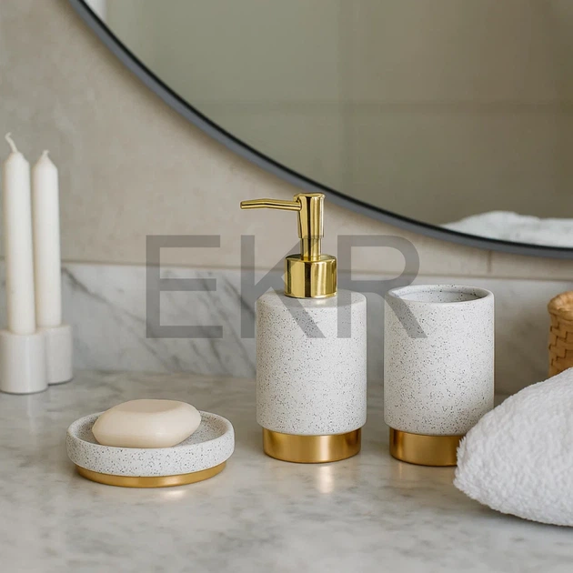 Набір "Golden Granite" для ванної кімнати: дозатор 350 мл, склянка, мильниця, білий граніт із золотом (851-335)