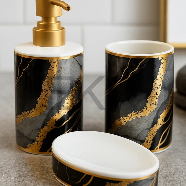 Набір аксесуарів для ванної кімнати "Чорний мрамор із золотом" – дозатор, склянка, мильниця (853-174)