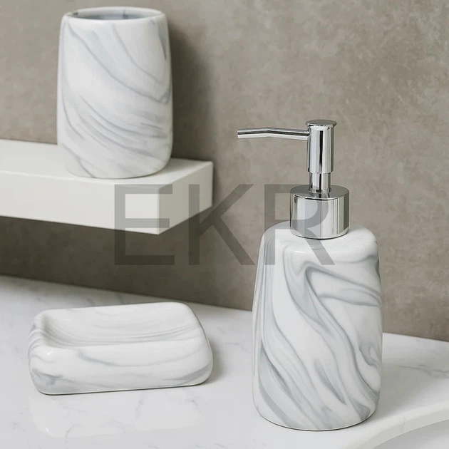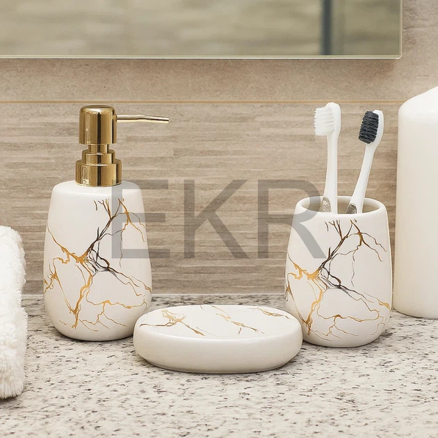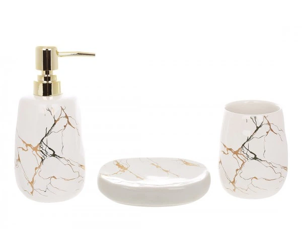 Набір для ванни (3 предмети): дозатор, склянка, мильниця, дизайн-білий мрамор із золотом
