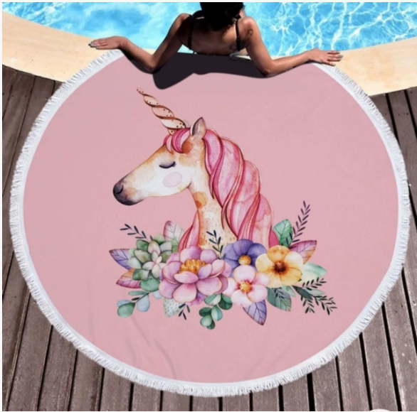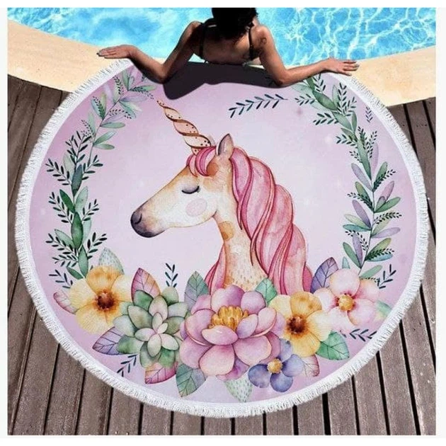 Кругле пляжне покривало "Єдиноріг у квітах", 150 см