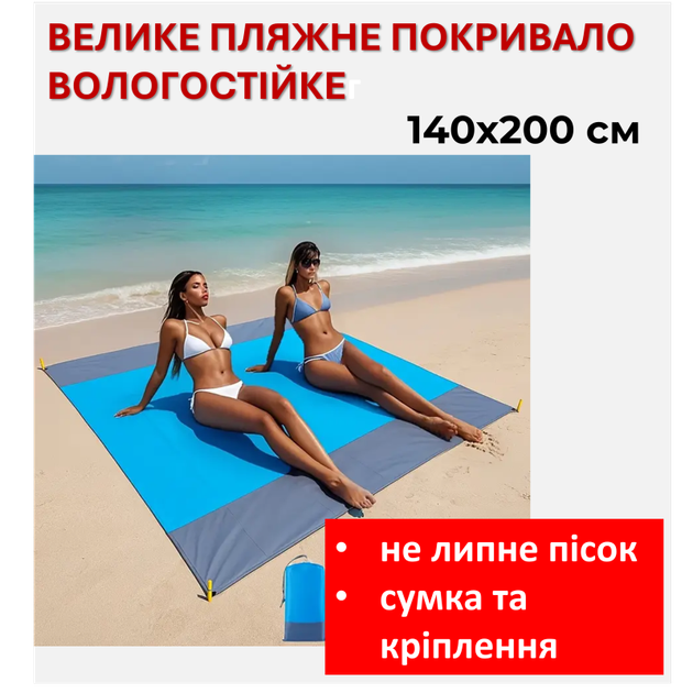 Велике пляжне покривало 140200 см - вологостійке і непродувне, з кріпленнями і сумкою, для відпочинку на природі