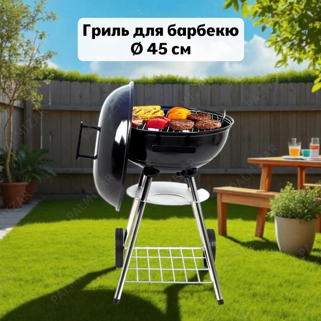 Вугільний гриль для барбекю, з кришкою, на колесах, круглий, металевий, висота 75 см, з місткою чашею 45 см, для приготуванн
