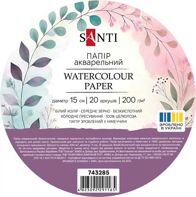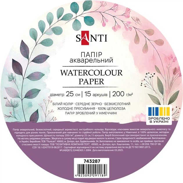 Папір акварельний Santi 25 см 15 аркушів 200 г/м2 (743287)