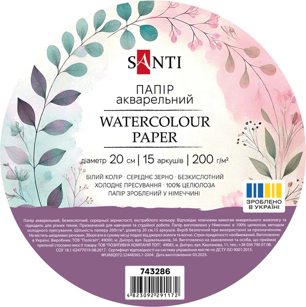 Папір акварельний Santi 20 см 15 аркушів 200 г/м2 (743286)