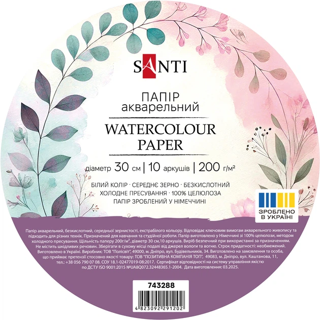 Папір акварельний Santi 30 см 10 аркушів 200 г/м2 (743288)