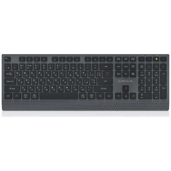 Виробник: REAL-EL. Стан товару: Новий. Призначення: для планшетів. Колір: темно-сірий. Тип підключення: бездротовий. Форм-фактор: повнорозмірна. Призначення: для настільних ПК. Інтерфейс: Bluetooth. Інтерфейс: радіоінтерфейс. Сумісність з ОС: Mac OS. Вага, г: 438. Мова розкладки: українська. Властивості клавіатури: регулювання нахилу. Мова розкладки: англійська. Сумісність з ОС: Android. Тип клавіатури: мембранний. Мова розкладки: російська. Живлення: акумулятор. Радіус дії радіоканалу, м: 10. Кількість додаткових клавіш: 6. Сумісність з ОС: Microsoft Windows. Сумісність з ОС: iOS. Кількість клавіш: 109. Колір символів кирилиці: білий. Розкладка клавіатури: ANSI (американська).