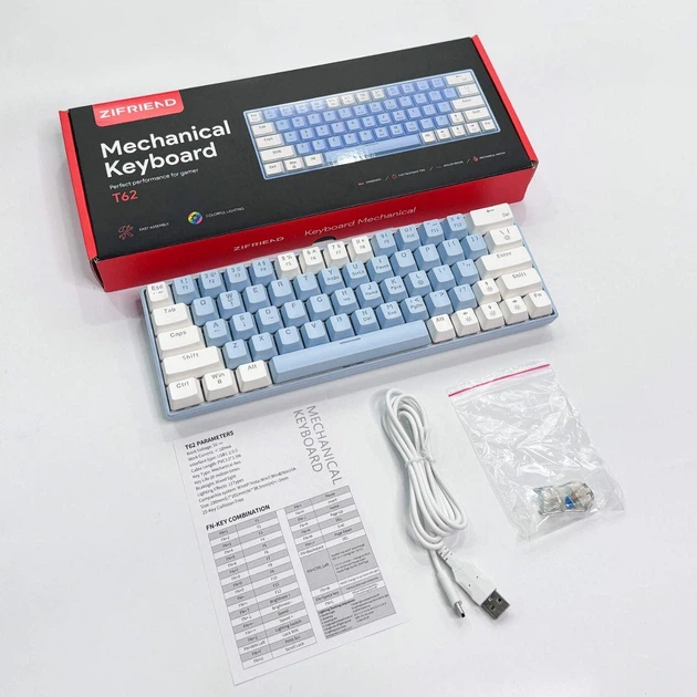 Клавіатура дротова Zifriend T62 60 механічна на синіх світчах з LED підсвіткою блакитно біла
