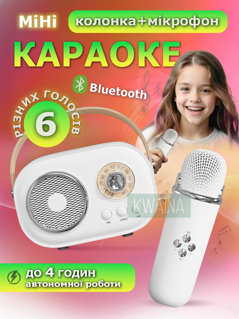 Портативна Bluetooth караоке колонка з мікрофоном, функція зміни голосу, USB, карта пам'яті, акумулятор 1000 мАг, білий
