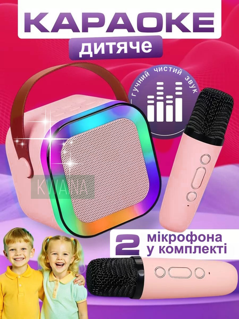 Портативна Bluetooth колонка бездротова з караоке ДВА мікрофони з різнокольоровим підсвічуванням, Рожева