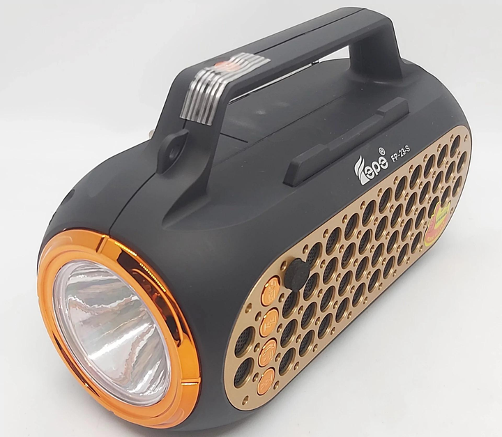 Портативна мультимедійна Bluetooth колонка-радіоприймач Fepe FP-23-S оснащена сонячною панеллю та ліхтариком.