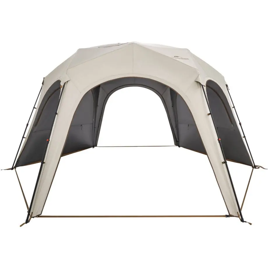 и властивостями (5000 мм вод. стовпа). Вініловий шар відштовхує 99,9% УФ-променів завдяки високому рівню захисту UPF 12500+. Стійки виготовлені з заліза та скловолокна. Розміри після встановлення сягають 462 х 400 х 224 см. Тент можна обʼєднувати з іншими тентами цієї серії.