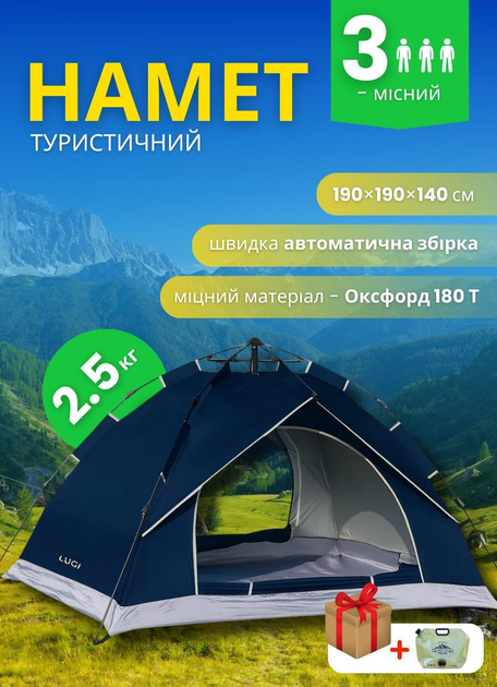 Автоматична палатка туристична 2 місцева 190х190х140 см туристичний намет на 2-3 особи з козирком і двома входами Синій + по