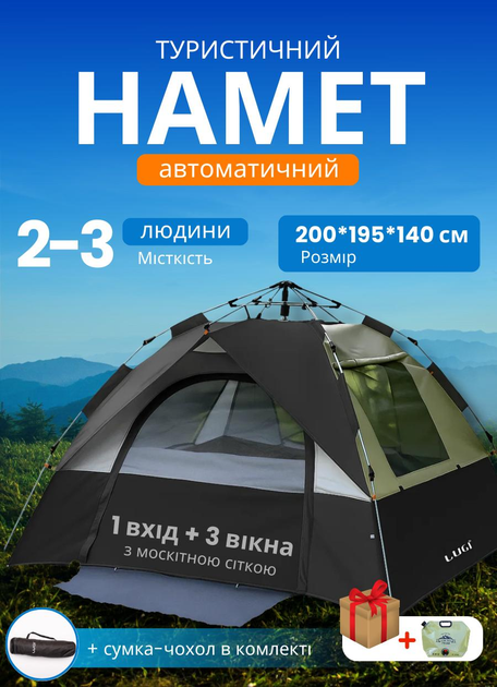 Автоматична палатка туристична 3 х місна 200х195х140 см кемпінговий намет з козирком і вхідним килимком Чорний + подарунок к