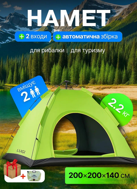 Автоматична палатка туристична 2 х місна 200х200х140 см LUGI кемпінговий намет із двома входами та гачком для освітлення Зел