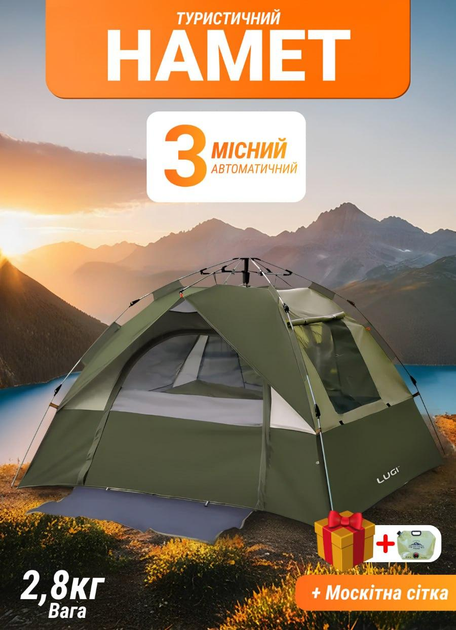 Автоматична палатка туристична 3 х місна 200195140 см кемпінговий намет з козирком і вхідним килимком Зелений + подарунок ка