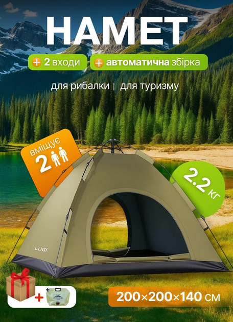 Туристична палатка автоматичного складання 2-місцева 200х200х140 см намет для кемпінгу з двома входами та гачком для підвісн