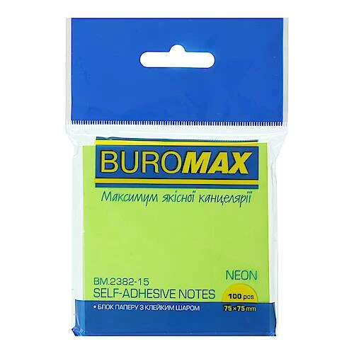 Блок для заметок NEON, 75х75мм, 100арк., салатовий 3 шт. в упаковку Buromax (BM.2382-15)