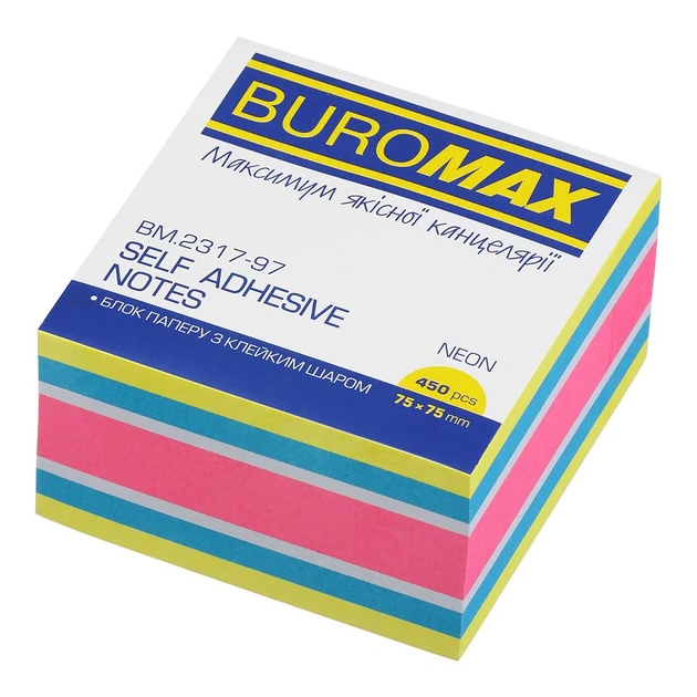 Блок паперу для нотаток з клейким шаром Buromax Neon 75x75мм 450 аркушів асорті (BM.2317-97)