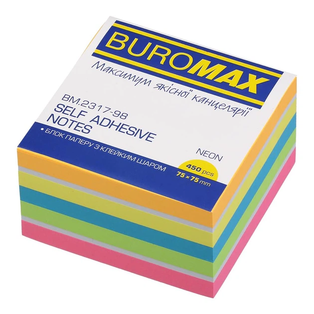 Блок паперу для нотаток з клейким шаром Buromax 75x75мм 450 аркушів неон асорті (BM.2317-98)