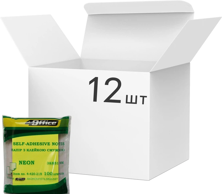Набір паперу для нотаток з клейким шаром 4office 38х51 мм 12 блоків по 100 аркушів Неон Mix (4-420-21N) (14820071015603)
