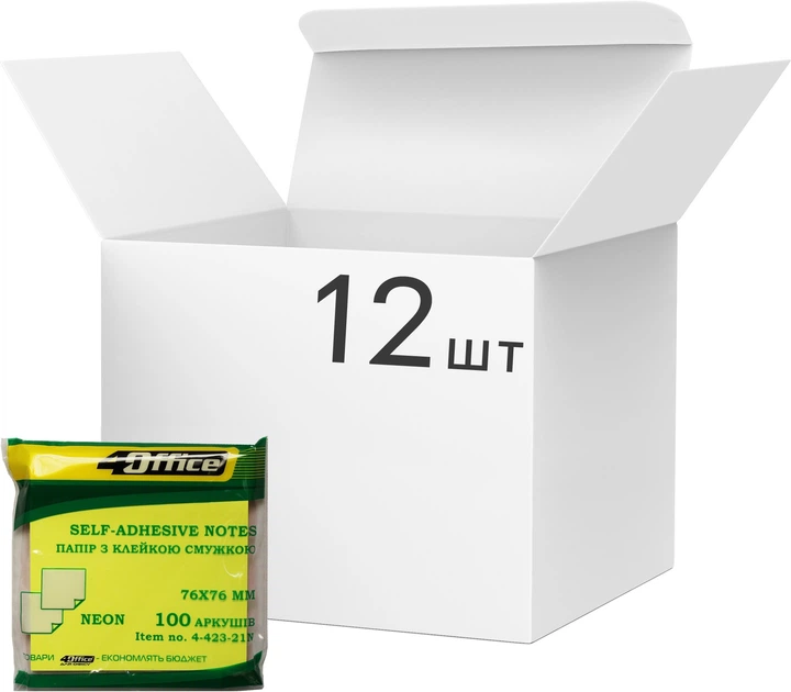 Набір паперу для нотаток з клейким шаром 4office 76х76 мм 12 блоків по 100 аркушів Неон Mix (4-423-21N) (14820071015429)