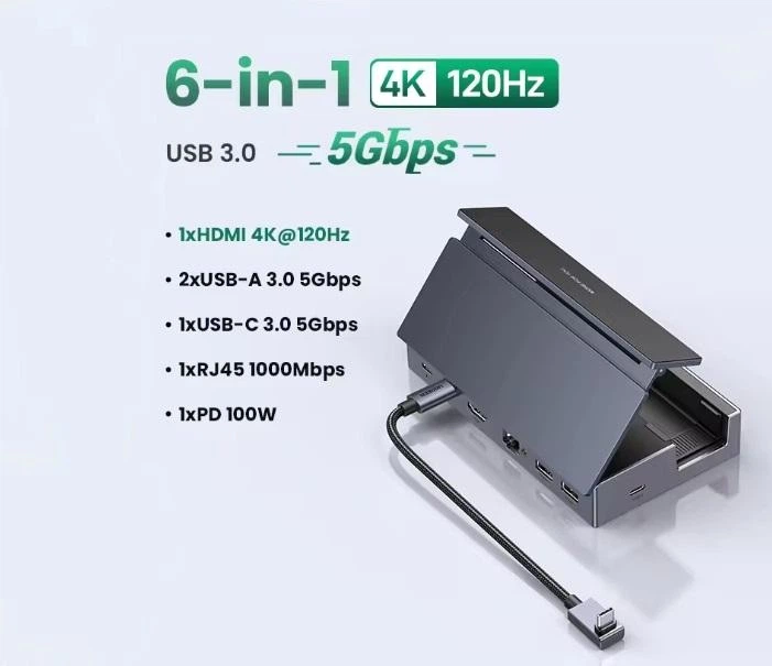 Універсальний USB-C хаб 6-в-1 UGREEN CM800 HDMI 4K 120 Hz PD 100 Вт Gigabit RJ45 для Steam Deck, Asus ROG Ally, Lenovo Legio