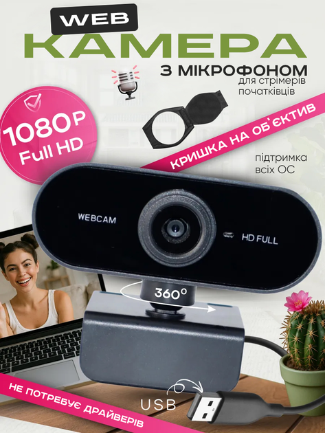 Веб-камера FullHD 1920x1080 Мікрофон, Plug and Play USB