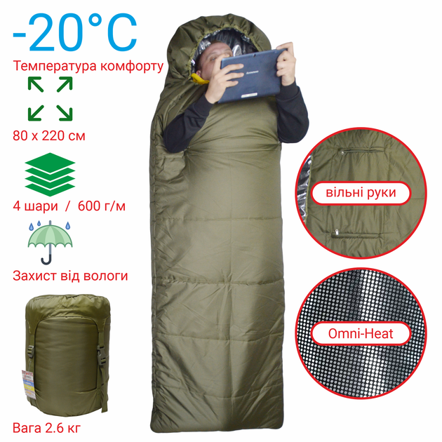 Спальний мішок ковдра з капюшоном армійський теплий зимовий тактичний -20°C, вільні руки, розмір 220х80см лівий DERBY Kanga