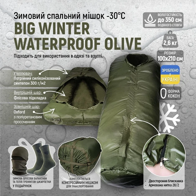 Зимовий спальний мішок Big Winter Waterproof -30°C Кокон 210х100 см водонепроникний Olive + Каремат