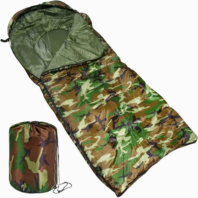 Демісезонний спальний мішок 220х70 см водовідштовхуючий камуфляжний холлофайбер з каптуром