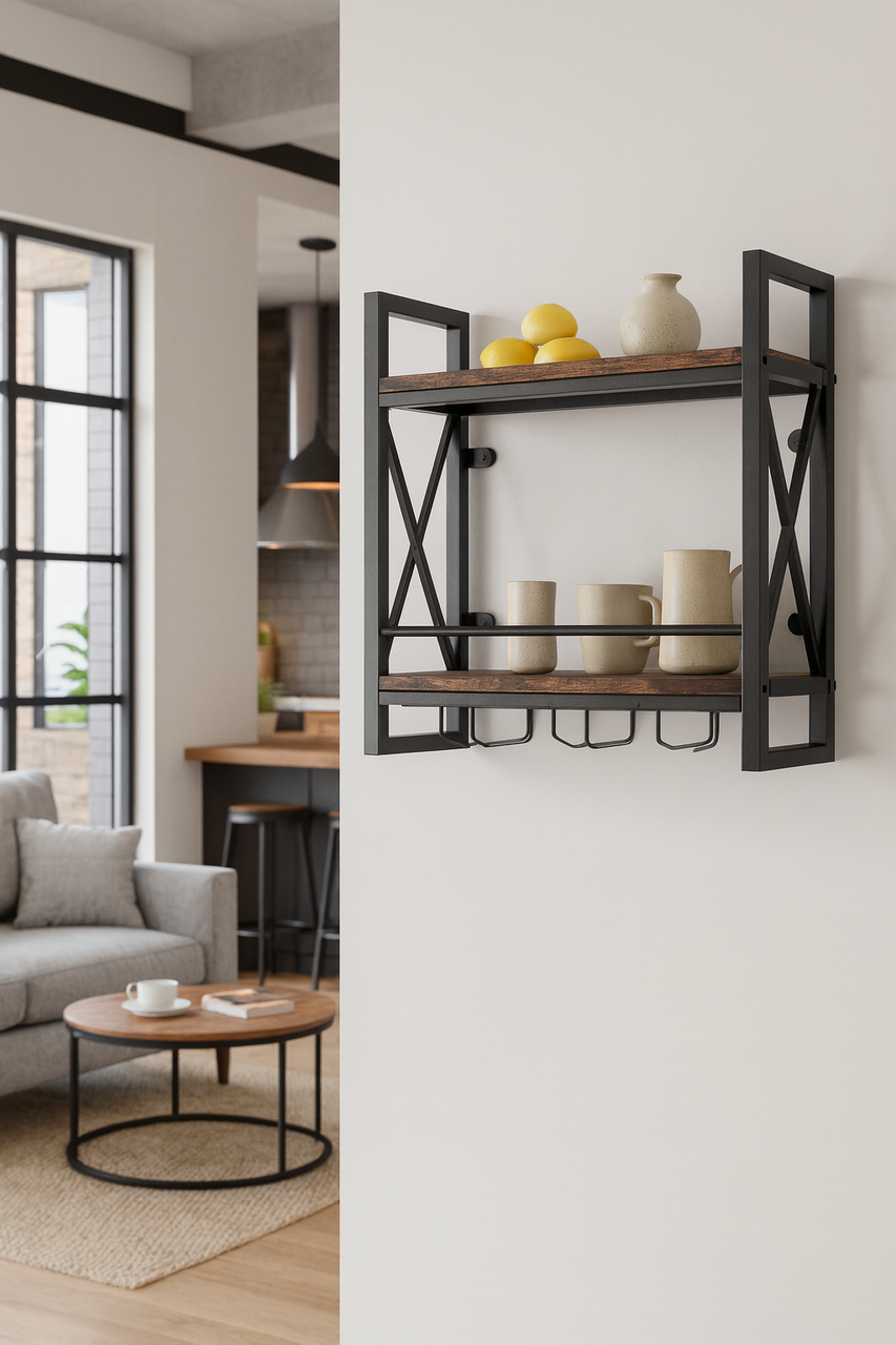 Винний стелаж Costway Lagom — це ідеальне рішення для поціновувачів функціональності й естетики. Завдяки настінному монтажу він економить місце на підлозі, водночас створюючи акцент у вашому інтер'єрі. Його міцна металева конструкція та полички з обробленої деревини надають йому промислової шарми, яка чудово підходить як до сучасних кухнях, так і до затишних барних зон. Обладнаний тримачем для келихів і захисною планкою, він гарантує зручне й безпечне зберігання пляшок і фужерів. Це не просто полиця — це декоративний і функціональний елемент, що перетворює зберігання вина на стильну виставку.