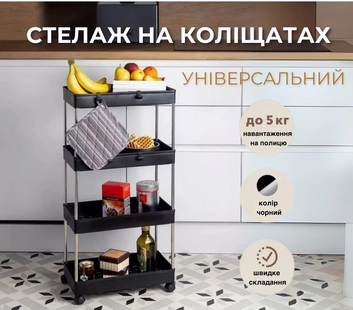 Полиця на колесиках пластмасова універсальна 4 яруса Чорна