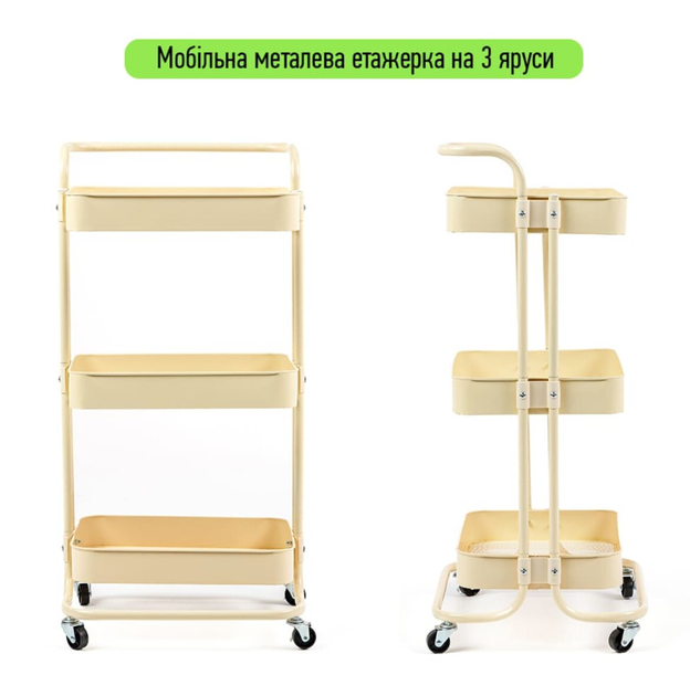 Металева кремова етажерка з ручкою і колесами, 3 яруси