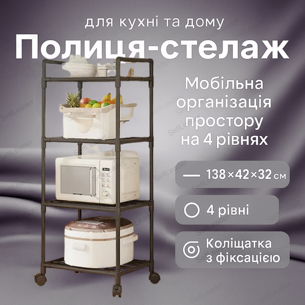 Полиця стелаж 1384232см на колесах для кухні етажерка 4 рівні чорний колір візок метал пластик для офісу