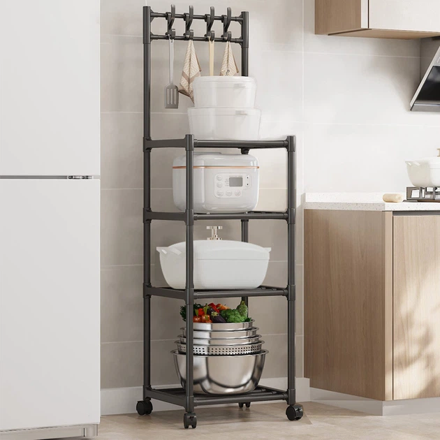 Кухонний стелаж 5 рівнів чорний метал 152 см з гачками і колесами