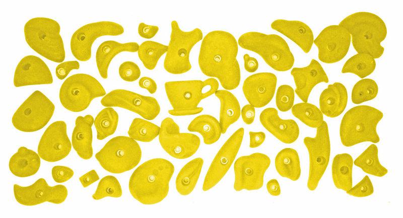 Комплект зачепів для скеледроми або дитячого майданчика — 54 штуки Кількість зачепів у комплекті — 54 шт. Розміри від 5 до 18 см. Матеріал — штучний камінь. Кріпляться до поверхні на болти М10 (не входять до комплекту)