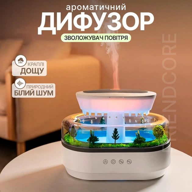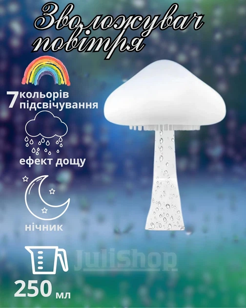 Зволожувач повітря з ефектом дощу підсвіткою RGB у вигляді гриба крапельный RAIN HUMIDIFIER з основою під дерево (білий)