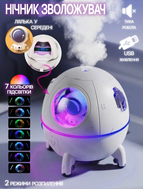 Ультразвуковий зволожувач повітря-нічник Air Purifier 3D Space-Capsule 7 кольорів підсвічування, USB