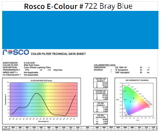Фільтр Rosco E-Colour+ 722 Bray Blue (67222) E-Color - це комплексна система європейських кольорових фільтрів Rosco для кіно - та відеовиробництва. E-Color включає в себе різні фільтри і матеріали для кольорокорекції, колірних ефектів, дифузії і відображення. Вони виробляються з використанням новітніх барвників і технологій склеювання, що забезпечує найвищий рівень надійності і продуктивності. Це Rosco E-Color + # 722 Bray Blue Filter. Оскільки і лінії Rosco E-Color, і лінії гелів LEE використовують європейську систему нумерації гелів, E-Color # 722: Bray Blue еквівалентний LEE # 722.