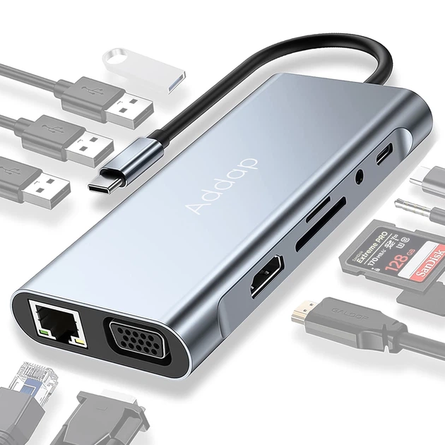 11в1 Type-C хаб для ноутбука Addap MH-13, багатофункціональний розгалужувач: 4 x USB 3.0 + Type-C + HDMI + VGA + Ethernet +