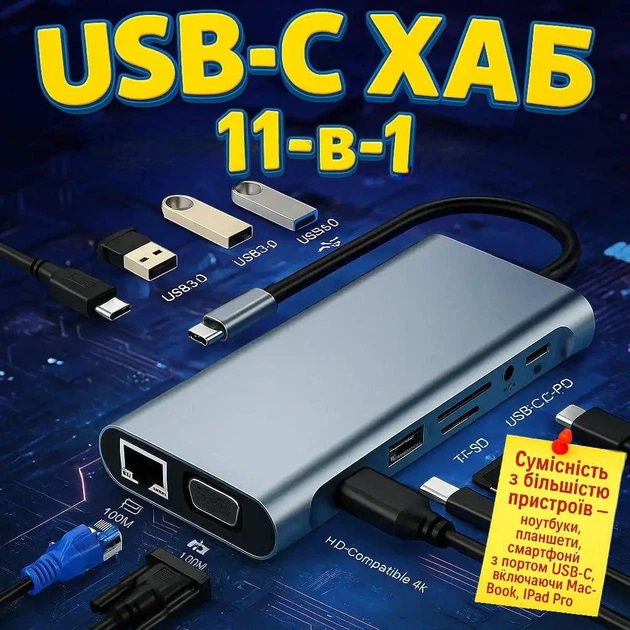 USB Type-C хаб 11-в-1 з HDMI 4K, VGA, RJ45, USB 3.0, кардрідером TF/SD, аудіо та PD зарядкою для ноутбука