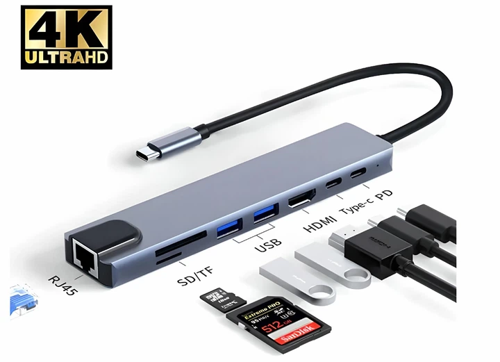 Багатофункціональний адаптер Тайп-С для ноутбука, Юсб хаб 8-в-1 Type C + USB HUB to HDMI/HDTV + PD + USB C + SD + TF + RJ45