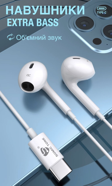 Навушники тайп сі провідні вкладиші з мікрофоном з роз'ємом type c 1.2 м для телефону C5 White