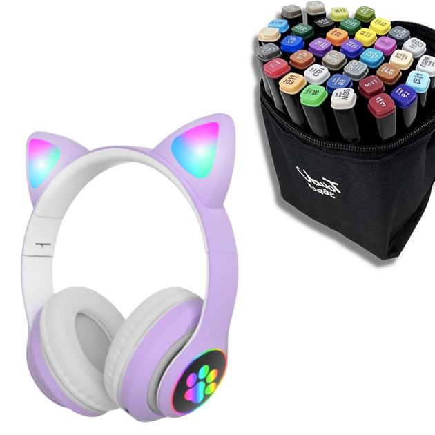 Навушники з котячими вушками з Bluetooth та підсвічуванням STN28 Фіолетові + Набір двосторонніх маркерів для малювання Touch