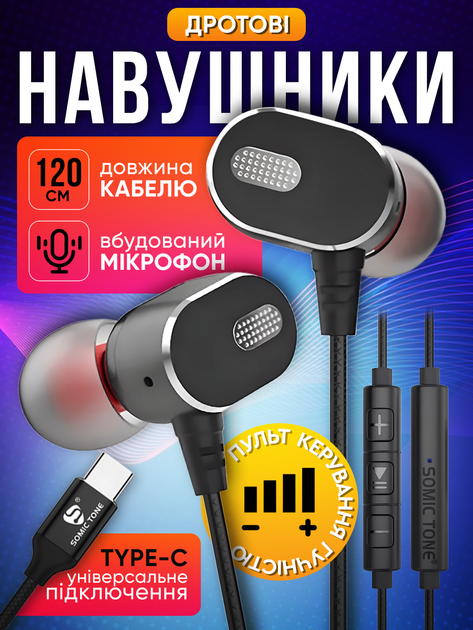 Дротові навушники USB Type-C з мікрофоном (1.2м) вакуумні гарнітура тайп си для телефону SomicTone C3 Black